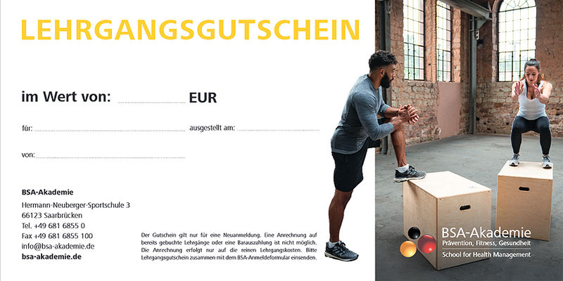 Die BSA-Akademie ist mit mehr als 275.000 Teilnehmern seit 1983 einer der führenden Bildungsanbieter im Zukunftsmarkt Prävention, Fitness und Gesundheit. Mithilfe der über 90 staatlich geprüften und zugelassenen Lehrgänge in den Fachbereichen Fitness/Individualtraining, Management, Ernährung, Gesundheitsförderung, Betriebliches Gesundheitsmanagement, Mentale Fitness/Entspannung, Fitness/Gruppentraining, Sun, Beauty & Care und Bäderbetriebe gelingt die nebenberufliche Qualifikation für eine Tätigkeit im Zukunftsmarkt!